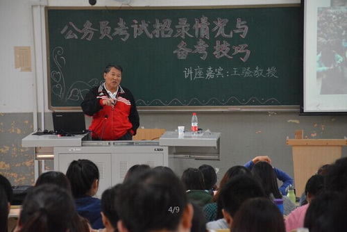 王骚分别从参加公务员考试的意义、公务员考试类别、招考条件、考试内容、测试目标、命题与阅卷原则、备考技巧、备考误区等方面对公务员考试相关问题进行了全方位的、深入细致的解读。还与现场同学进行了即时互动,详细解答了同学们提出的各种公考问题。讲座结束后,同学们意犹未尽,纷纷表示受益匪浅。