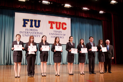 随后, Hampton 为获得万豪奖学金的 8 名同学颁发获奖证书,并为 2013 级学生佩戴 FIU 校徽;最后, 2013 级学生代表与 2015 级新生代表分别发言,表达了自己进入 TUC—FIU 合作学院学习的激动心情,表示要以百倍的努力回报学校领导与老师们对他们的培养,在学习和生活中不断成长与完善自我,成为品学兼优的酒店业优秀人才。