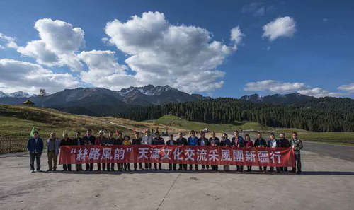 9 月8 日,由天津、新疆(含自治区、兵团)两地三方文联、美协、书协及新疆天津商会、新疆丝路驼客(中国)文化传播有限公司联合主办的“丝路之路 • 津疆风韵”书画联展在红光山亚欧艺术馆开幕。229 位老中青名家的 227 件书画精品亮相首府,同时《丝路风韵 —— 天津新疆书画作品集》首发。艺术学院王其华教授应邀出席了此次联展,并于新疆绘制大幅中国画《葡萄熟了》。艺术研究所常务副所长柳春水的作品《西域雄关道,云天大漠行》也应邀参展。
