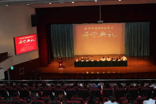9 月 11 日,经济学院 2015 级新生开学典礼在科学会堂举行。院长刘小军、院党委副书记张玉娟、副院长巫建国、副院长王常柏及各系主任出席开学典礼,学院全体辅导员及全体 2015 级新生参加了典礼。院团委书记刘宁主持典礼。