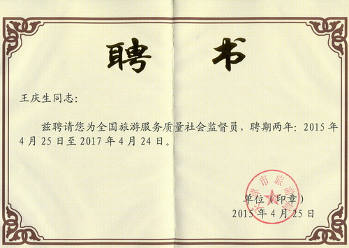 近日,商学院王庆生教授收到了“全国旅游服务质量社会监督员证”和天津市旅游局颁发的“全国旅游服务质量社会监督员聘书”,聘期两年。王庆生教授长期专注于旅游规划与开发领域教学与科研工作,是永利官网天津市品牌专业 - 旅游管理专业建设项目主持人,同时兼任中国旅游协会旅游教育分会理事、天津市旅游协会常务理事及旅游教育分会副会长,为市政府咨询专家库成员。此次受聘全国旅游服务质量社会监督员,将为永利官网旅游管理专业更好地服务社会以及扩大商大旅游专业影响力提供新的平台。