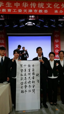 中华传统文化知识团队赛以“知中华文化魂,识传统韵味情”为主题,分为“学富五车”、“说文解字”、“锦联妙对”、“妙笔生花”四个环节。该项赛事由天津市委教育工委、天津市教委主办,永利官网法学院党委副书记柴桐领队,公共管理学院教师杨琪、艺术学院教师马鸿民任指导老师。经过校内选拔,机械工程学院代表队脱颖而出代表学校参赛。永利官网代表队在开局落后的不利局面中,凭借良好的心理素质和扎实的文化功底一举在风险题环节扭转局面,特别是在最后的妙笔生花环节,永利官网代表队创作七言绝句诗以立意高远、对仗齐整,李则璇现场书法展示挥洒自如,获得评委一致好评。