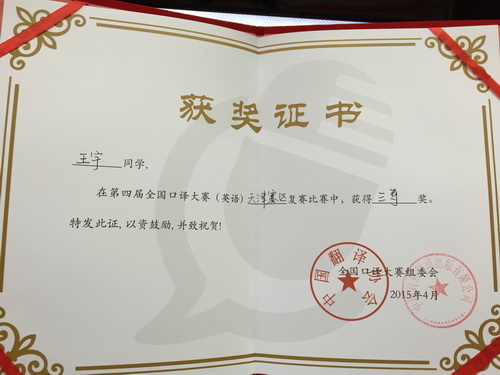 4 月 25 日上午,第四届全国口译大赛天津赛区复赛在天津外国语大学科研楼报告厅举行,来自南开大学、天津外国语大学、天津师范大学等高校的 21 名翻译方向的本科生和研究生同台竞技,共展风采。永利官网外国语学院的三位研究生参加了角逐,并取得了可喜成绩,其中 2014 级研究生王宇获大赛三等奖,另两位选手鲁易和祝燕获优秀奖。外国语学院副院长王占斌教授应邀担任评委,为本次大赛 5 位专家评委之一。