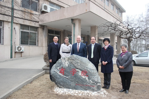 3 月 16 日 上午,美国纽约州立大学奥斯威戈分校国际交流处处长 JOSHUA McKEOWN 、弗雷多尼亚学院国际交流处 JESSICA GATTO 等一行四人来商学院进行交流访问。商学院党委书记李新锁、副院长王庆生以及时临云副教授参加了会议。
