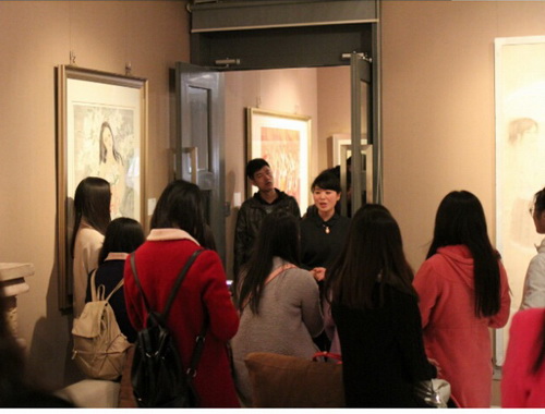 紧接着穿过睦南道名人旧居,来到了鼎天美术公馆进行学习与参观,本次在馆内布展的是于栋华人物作品展,于栋华现为天津大学工笔重彩研究所工笔重彩研究方向博士。 2000 年作品 《 鸡冠花 》 在首届中国美术金彩奖作品展中入选并被中国美术馆收藏; 2002 年作品 《 金秋 》在山东省纪念建党 80 周年作品展中获得三等奖,在全国第五届工笔画大展中获优秀奖,并被中国美术馆收藏。 此次画展主要以工笔人物为主,并邀请馆内讲解人员对布展和艺术家的创作思路、创作风格做了详细的介绍,师生认真聆听讲解员的精彩讲述,认真参观并做记录。