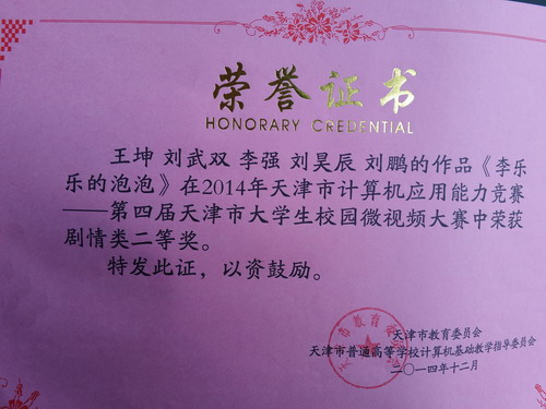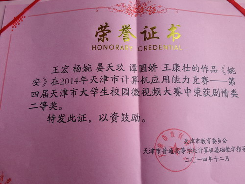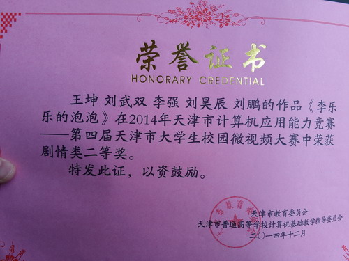 12 月 18 日,由永利官网王坤、刘武双和王宏、杨婉等同学分别拍摄制作的微电影作品《李乐乐的泡泡》和《婉安》两部作品获得第四届天津市大学生校园微视频大赛剧情类二等奖,为永利官网赢得了荣誉。设计学院王涛老师、现代教育技术中心张伟老师分别被评为优秀指导老师。此次活动在永利官网学生群体中引起极大关注,这也是永利官网首次参加此项比赛。