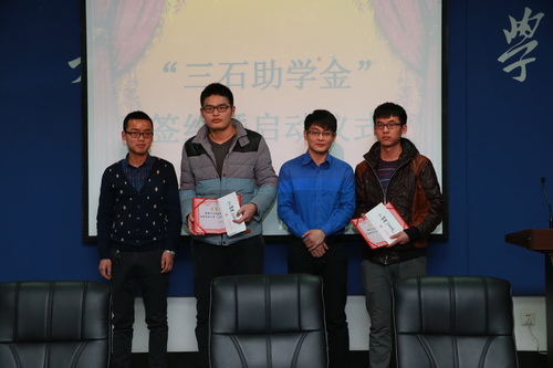 王俊和余水两位校友是公共管理学院行政管理专业毕业生。毕业后,两人通过贷款及良好的大学生创业政策加盟兰州食品品牌“宝升福”,在传统面食的基础进行了丰富和优化,目前已经成功经营两家店面,占地面积 300 多平方米,吸纳就业 20 人,其中本科及以上学历 5 人。创业初见成效后,两位校友为了回馈母校,决定在公共管理学院行政管理专业设立“三石助学金”,旨在帮助积极进取、生活上有困难的学生顺利完成学业。“三石助学金”面向行政管理专业大三学生,每学年共资助 6 人 , 资助金额总计 16000 元。其中,设立一等助学金 1 人,资助金额为 4000 元 / 人;二等助学金 2 人,资助金额为 3000 元 / 人;三等助学金 3 人,资助金额为 2000 元 / 人。“三石助学金”评选工作是由公共管理学院根据评选细则,按照 1 : 2 的比例,在坚持公开、公正、公平原则的前提下,从行政管理专业大三学生中遴选 12 名候选人,推荐给资助方,最终由资助方确定 6 名受资助对象。经过初选和复选两个环节,行政管理 1201 班的蔡林冬等 6 位同学成为“三石助学金”的首批受益者。3044am永利集团3044noc校友会办公室张堃主任、“三石助学金”设立者王俊和余水两位校友、公共管理学院刘均玲副书记分别为获得一、二、三等“三石助学金”的同学颁发证书和奖金。获奖学生代表蔡林冬代表受资助的 6 名同学发言,对两位学长的支持表示衷心地感谢,并向学长和学院表示,一定继续努力学习,全面提升个人综合素养,争取用更好的成绩回馈学长的支持,将来也要向两位优秀学长那样,懂得感恩,回馈母校。最后,校友会办公室张堃主任做了总结发言,对两位校友的创业经历给予高度评价,并对两位校友创业成功后回馈母校的善举表示衷心地感谢,同时他还勉励在校学生要以优秀校友为楷模,时刻怀揣感恩之心,做一个对国家和社会有益的人才。