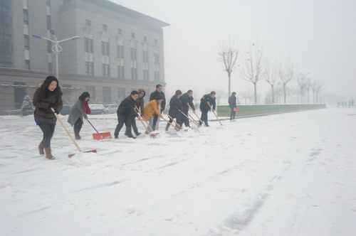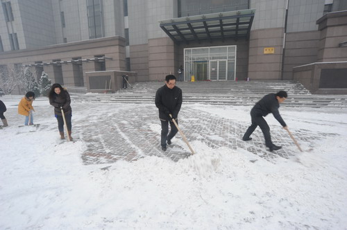 今冬的第一场雪,让美丽的校园披上盛装,也给广大师生出行带来安全隐患。为了方便广大师生进出图书馆,图书馆组织工作人员义务除冰扫雪。在党支部书记陈文生的带领下,同志们不畏严寒,热情高涨, 经过一个多小时的奋战,图书馆门前主干道积雪就被清扫干净,为读者开辟了一条洋溢着温情的方便之路。