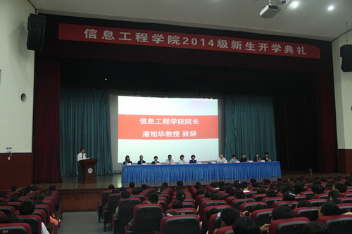 9 月17 日上午,信息工程学院在科学会堂举行2014 级新生开学典礼。院长潘旭华、院党委副书记王艳军、副院长陈雷、通信工程系系主任赵建强、自动化系系主任申芳、商务信管系系主任高岩、计算机系副主任尉斌、院办公室主任郭英慧、学院全体辅导员老师、新生班主任和院团委、学生会干部出席,全体 2014 级新生参加。