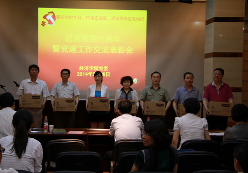 5月28 日下午,经济学院党委在校工会多功能厅召开以“喜迎党的生日,传播正能量,建设服务型党组织”为主题的纪念建党93周年党建工作交流表彰会。组织部部长王罡、宣传部部长张克明、经济学院党员领导干部以及全体教工党员参加了会议。经济学院院长刘小军应邀出席会议并讲话。会议旨在激发党员的工作热情,增强学院发展活力,引导党员教书育人做楷模,贡献力量当先锋,巩固党的群众路线教育实践活动成果。
