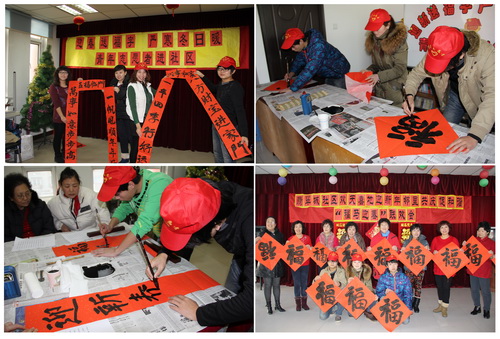 在农历春节即将到来之际,艺术学院的志愿者同学们运用自身的艺术专业特长,为居民们书写了一幅幅春联和一张张福字,送去了诚挚的新春祝福,活动得到了瑞景街道、社区居委会和广大社区居民的一致认可和好评,天津日报、北辰新闻中心等媒体进行了报道。