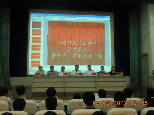 9月8 日 , 法学院 2013 级新生开学典礼暨入学教育第一讲在学术交流中心隆重举行。出席本次开学典礼的嘉宾有法学院党委书记于忠祥,院长齐恩平,副院长吴春雷、孙学亮,法学系主任沃耘,应用心理学系主任艾娟; 法学院辅导员王舒婷、谭娜娜、 2013 级各班班主任及法学院 2013 级本科生和研究生参加, 法学院党委副书记柴桐主持。