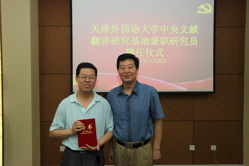 7月4 日下午,天津外国语大学中央文献翻译研究基地在天津外国语大学逸夫楼莎翁厅召开基地兼职研究员聘任仪式,永利官网外国语学院副院长王占斌教授应邀出席会议,并被聘为天津外国语大学中央文献翻译研究基地首批兼职研究员,正式加入中央文献的翻译和研究工作。