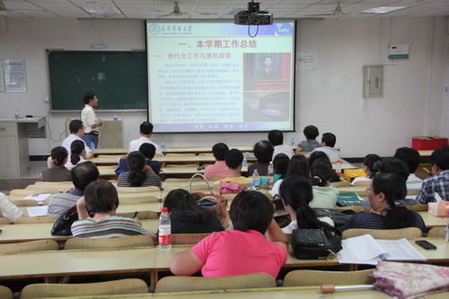 6月26日 ,信息工程学院在4教203召开全院教职工大会,总结上半年工作、布置期末任务。大会由学院党委书记刘振航主持,院长潘旭华、副院长陈雷、党委副书记王艳军以及全院教职工出席了大会。