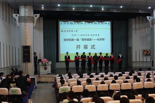 本次开幕式分为两个部分。第一部分中,校团委副书记严慧菁首先致开幕词。她对本次化学周的开幕表示热烈的祝贺,同时代表校团委向全体学生提出了锻炼能力、提高素质;树立敢于创新、勇于实践的精神;将所学化为所用的三点希望。接下来,理学院化学系主任巩运兰教授带领同学们走近了化学的世界,感悟了化学之美。南开大学化学学院院长、天津市化学会副理事长刘育教授百忙之中也参加了本次开幕式,他对化学周活动的开幕表示祝贺,并希望天商学子 培养、构建迅速思维的科研素养,解决新问题,创造新理念,增长新才干,成为一名有创新思想、适合学科发展、具备科学素养的复合型的优秀人才。天津市化学会也专门为本次活动发来了贺电。 当罗蕴玲院长郑重宣布理学院第一届化学周开幕后,刘育教授、罗蕴玲院长、校团委副书记严慧菁、一同为开幕式剪彩,预示化学周活动正式启动。第二部分中,理学院学生会主席衣瑞琳详细介绍了化学周各项活动安排。南开大学教务处处长杨光明教授为大家带来了题为《体会化学内涵,享受生活品质》的讲座。从生活中的衣食住行、生老病死八个方面详细介绍了化学在生活中的应用,同时重点对食品安全方面进行了讲解。杨教授的讲座生动活泼、深入浅出,通过日常生活中的点点滴滴提示化学时时刻刻影响着我们的生活。