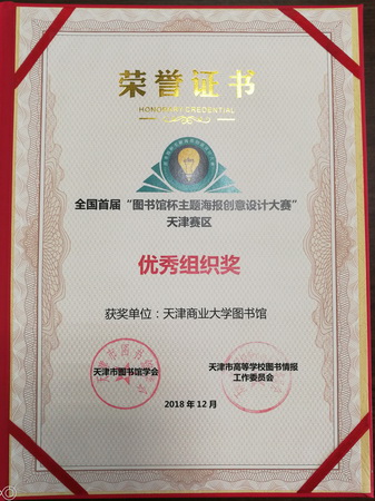 日前,由中国图书馆学会阅读推广委员会主办,阅读推广委员会大学生阅读推广专业委员会、阅读推广委员会图书馆与社会阅读专业委员会等联合承办的全国首届“图书馆杯主题海报创意设计大赛”结束。永利官网图书馆在本次大赛组织工作中表现突出,荣获天津赛区优秀组织奖,图书馆馆员任学民、张倩、何芸获得个人优秀组织奖。