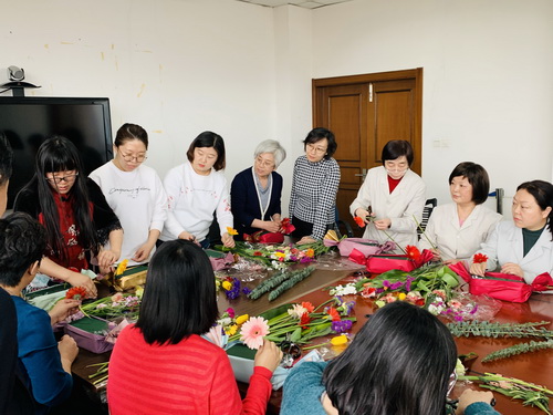 本次活动包括花艺和“一分钟健身”两部分。图书馆分会特邀了专业花卉老师讲解不同花卉的象征意义、养殖培育技巧和搭配方式,并现场带领教职工们亲手制作插花作品。花艺活动后,女教职工在工会活动室开展了“一分钟健身”活动,需要在一分钟内完成平板支撑、跳绳、踢毽子、金鸡独立四项趣味体育运动,旨在倡导健康快乐的生活方式。