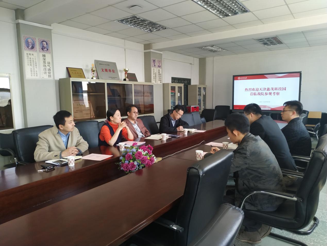 安建业首先对鑫茂科技园代表的到来表示热烈欢迎,并对学院概况及人才培养特色进行了基本介绍,表示校企合作、产学结合是目前的大方向,学院就此方面也在进行积极探索。周严表示,希望依托科技园这个平台架起学校和企业之间的桥梁,为学校提供企业的需求,同时为企业提供各学科专业人才团队。杨璐伊介绍了学院学生特色和就业情况,并希望今后能在学生实习、组织参观、社会实践、创新创业培训等方面达成合作。边学书介绍了鑫茂科技园的发展情况、园区内企业情况等内容,并就目前与其他院校间的校企合作方式进行了详细介绍。