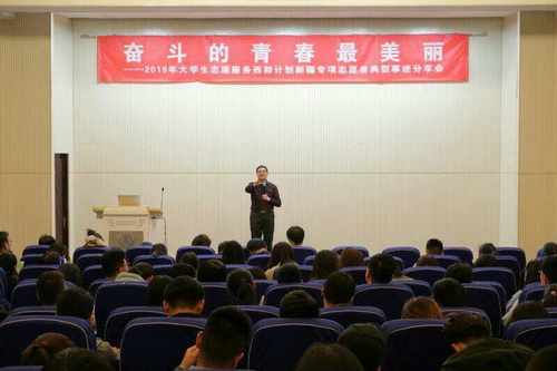 4月16日晚,2019年大学生志愿服务西部计划优秀志愿者典型事迹报告会在七号教学楼二楼报告厅举行。报告会以“奋斗的青春最美丽”为题,邀请新疆和田团地委党组织成员、团委副书记颜伟及部分优秀青年志愿者作为主讲嘉宾。团委书记辛佳澎以及各学院团委书记出席报告会。200余名应届毕业生学生代表参加了此次活动。