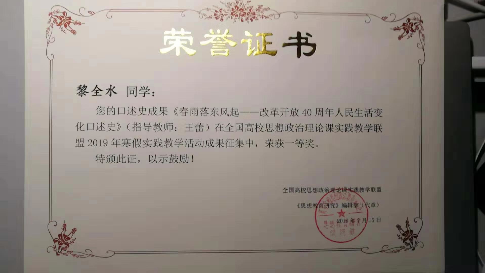 此次活动由全国高校思想政治理论课实践教学联盟主办,《思想教育研究》编辑部、北京科技大学马克思主义学院等单位承办,成果内容和形式分为口述史和微电影两类。本次成果征集活动中,口述史部分共收集到来自全国74所学校报送的作品474件,微电影部分共收集到来自全国47所学校报送的作品94件。由马克思主义学院王蕾老师指导的,法学院法学1704班学生黎全水的口述史作品《春雨落东风起——改革开放40周年人民生活变化口述史》、国际教育与合作学院国际财务1703班学生倪玲的口述史作品《家乡40年家庭联产承包责任制》分获一等奖和二等奖,为永利官网赢得了荣誉。