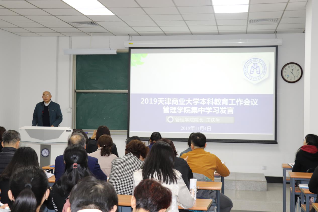 院长王庆生就《教育部关于深化本科教育教学改革全面提高人才培养质量的意见》(简称“40条”)、《教育部关于加快建设高水平本科教育全面提高人才培养能力的意见》(简称“22条”)进行了宣讲和详细解读,并介绍了学院下一步如何抓好本科教育。宗毅对《教育部关于加强和规范普通本科高校实习管理工作的意见》、《市教委关于落实全国教育大会精神推动本科教育高水平发展的实施意见》、《天津市高水平本科教育2035》等文件精神进行解读,并对学院本科教育工作会议研讨学习方案进行部署和说明。副院长王庆就“商学素养”内涵的理解与全体教职工进行分享,使全院教职工进一步加深了对“商学素养”内涵认识理解。