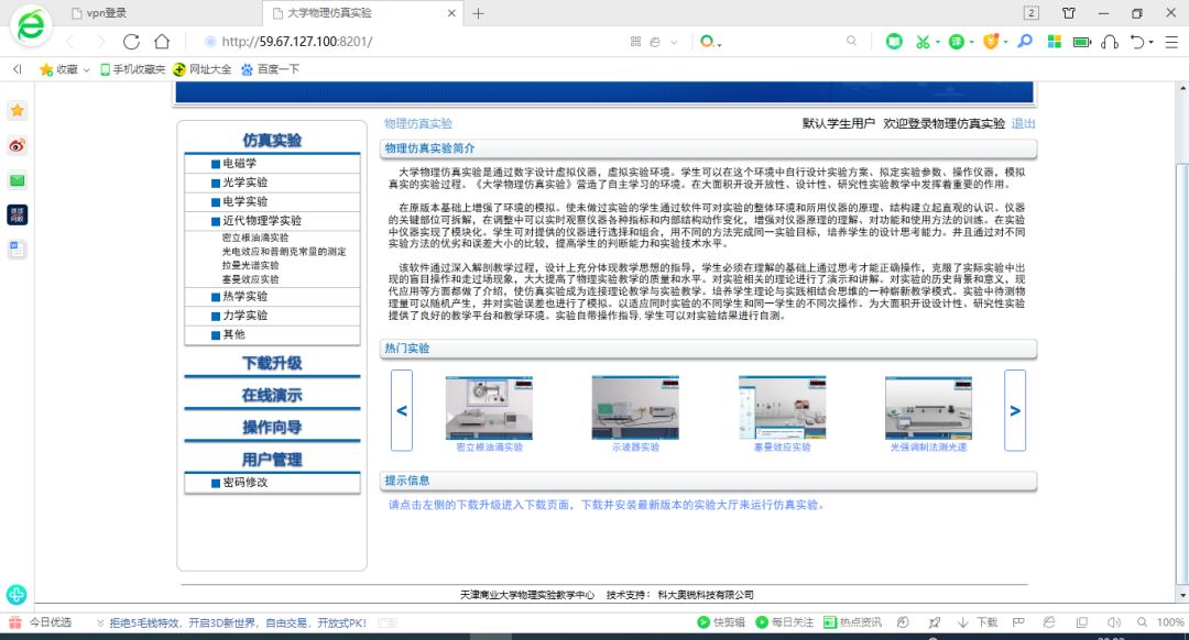 在资产设备处和网络与信息化中心领导、老师们的大力支持下,黄书彬老师迅速调试,经过大家紧张有序的配合,成功将物理实验仿真大厅模块导入至VPN资源列表中的教学应用区,实现了依托超星在线学习平台+校内虚拟仿真系统,让物理实验课实现“离校不离教,停课不停学”。