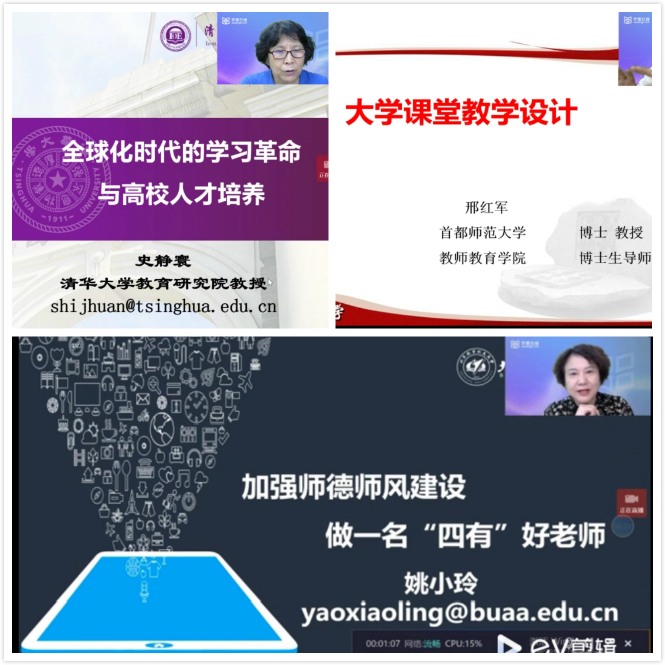 在直播讲座板块,清华大学教育研究院史静寰教授,国家级教学名师、陕西师范大学傅钢善教授,清华大学电机系于歆杰教授,全国师德先进个人、北京航空航天大学姚小玲教授和首都师范大学教师教育学院邢红军教授,分别以“全球化时代的学习革命与高校人才培养”、“信息技术环境下如何上好一堂课”、“教师上好课的三部曲”、“加强师德师风建设,做一名‘四有’好老师”和“大学课堂教学设计”等为题,分析全球高等教育的变革历程,提出当前我国高等教育以内涵发展和提高质量为主要目标,阐述高校人才培养的新要求,用生动的实例勾画“水课”之画像,拆解“金课”之内涵,解读新时代教师的责任和担当,强调师德师风是评价教师队伍素质的第一标准。要求作为新入职教师要积极践行立德树人的根本任务,适应信息技术对于学习方式的改变,努力提升课堂的内涵与层次。