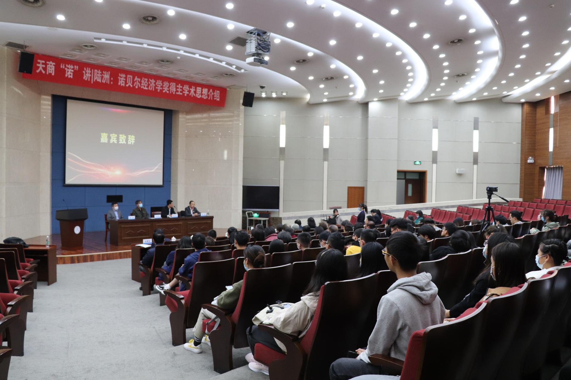 为聚焦“诺”奖热点,探访“天商诺库”,营造学术氛围,助力学科建设,11月4日下午,由图书馆、经济学院、科研处和学科办联合举办的“天商诺讲”系列活动正式启动。图书馆、经济学院、科研处相关负责人和各学院教师、研究生以及本科生200余人参加。