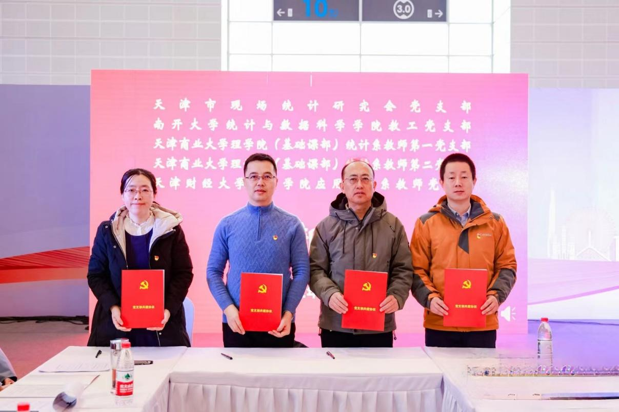 11月26日,理学院(基础课部)统计系教师第一党支部和第二党支部与天津市现场统计研究会党支部、南开大学统计与数据科学学院教工党支部、天津财经大学统计学院应用统计系教师党支部在国家会展中心举办了“产教融合·支部共建”签约仪式。来自天津市现场统计研究会、南开大学、3044am永利集团3044noc、天津财经大学、天津职业技术师范学院、天津市跨境电商协会等二十多名教师和企业家代表参加。