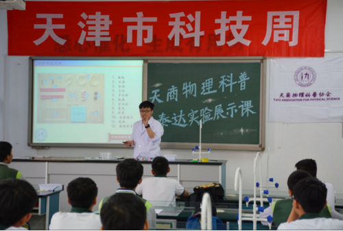 5月21日下午,理学院下设的“天商物理科普协会”学生社团举办校外“科普实验展示”活动。协会成员们走进红桥区泰达实验中学,为七、八年级的中学生们讲授了一堂与众不同的展示课。