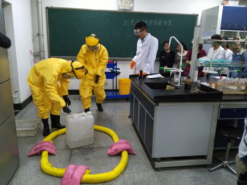 9月27日下午,资产设备管理处在4号实验楼开展了知识讲座及意外事故应急演练活动。处长杨永安再次指出实验室安全是重中之重,每一位师生都要牢记本次活动主旨,强化安全意识,规范安全管理,消除安全隐患,确保实验安全。主讲教师屈俊勋老师以“实验室化学品安全管理和实践”为题,从典型危险化学品事故案例,危险化学品相关法律法规,危险化学品的概念分类和危害,危险化学品标识及MSDS管理,危险化学品的安全存储、管理与防护,废弃化学品的收集、存储与处置以及危险化学品的泄露处理与防护七个方面结合实际案例及经验进行了细致详尽的讲解。并指导实验室师生进行了危险化学品泄漏应急演练,人员自救,启动应急预案,组织专业救援,事故现场处理,以及后续事故报告分析等工作等做了现场演练。
