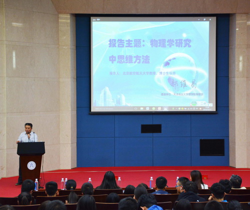 10月11日下午,应理学院物理系邀请,北京航空航天大学物理科学与核能工程学院博士生导师郝维昌教授在图书馆三楼学术报告厅作了题为“物理学研究中思维方法”的专题报告。物理系主任刘跃参加会议,系副主任周严为报告致辞。相关学科的师生聆听了郝维昌教授的精彩报告。