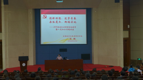 近日,生物技术与食品科学学院在图书馆三楼国际报告厅举行“躬耕理想,筑梦青春;桑弧蓬矢,脚踏实地”—2016级新生理想信念教育暨入党知识专题讲座。讲座由学院学工办主任、团委书记陈璐主讲,学院党委副书记王好军、辅导员陈相霓、2016级全体新生400余人参加。