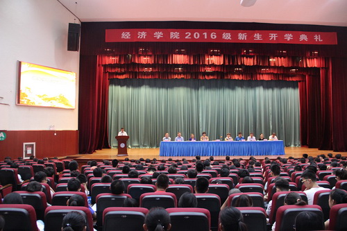 9月5日上午,经济学院2016级新生开学典礼在科学会堂举行。院长刘小军、院党委书记鲁晓翔、副院长巫建国、党委副书记张玉娟、各系(所)主任、教工党支部书记、全体辅导员及新生班主任出席,2016级639名本科生参加典礼。