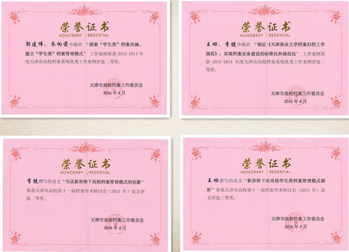 会上,天津市高校档案工作委员会秘书长、天津工业大学档案馆馆长韩海涛代表理事会作2015 年工作总结报告,部署2016 年工作任务,明确了今年高校档案工作重点及发展方向。与会领导向2015 年度优秀工作案例获奖者和天津市高校第十一届档案学术论文获奖者颁奖。永利官网分别获得优秀工作案例二等奖两个;优秀论文二等奖、三等奖各一篇。