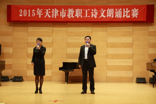 近日,由市教育工会主办的 2015 年天津市教职工诗文朗诵比赛在天津音乐学院落幕。来自全市各区县、高校的 42 组教职工选手参加了比赛。学校教职工朗诵协会成员、校友工作办公室许洪涛和产学研办公室储阳代表学校参加了本次比赛。比赛中,许洪涛、储阳凭借双人组合朗诵《相信未来》获得三等奖,为学校争得了荣誉。