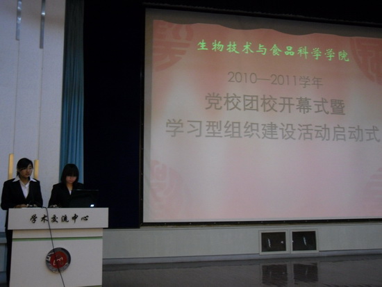 9月28日,生物技术与食品科学学院2010—2011学年第一期党校团校开幕式在学术交流中心举办。学院党总支书记鲁晓翔教授、校党委组织部副部长王立云老师、学院党总支副书记孙文利老师、团委书记陈璐老师、辅导员吴强老师等出席,学生党支部、团委、学生会及新生骨干学生近200人参加了开幕式。